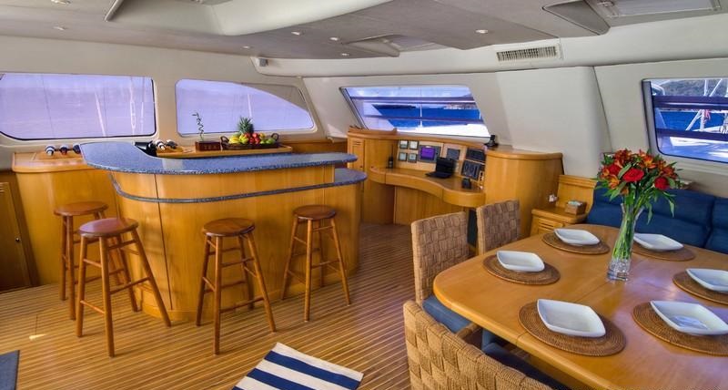 The salon is an open plan, great for socializing, offering an L shaped sofa and formal dining on the starboard side, with a complete wet bar to port. Wide sliding glass doors open onto the spacious aft deck, providing a fabulous entertaining venue.