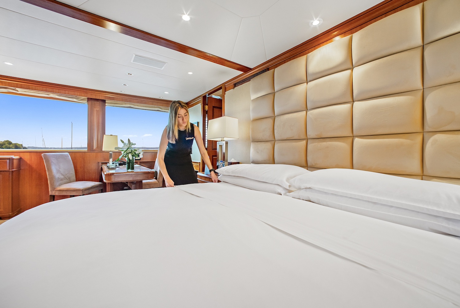 The full-width primary stateroom with a king bed is located on the main deck forward with full-width his/her bathrooms. Four beautifully-appointed en suite guest staterooms are located below (3 queens and 1 twin).