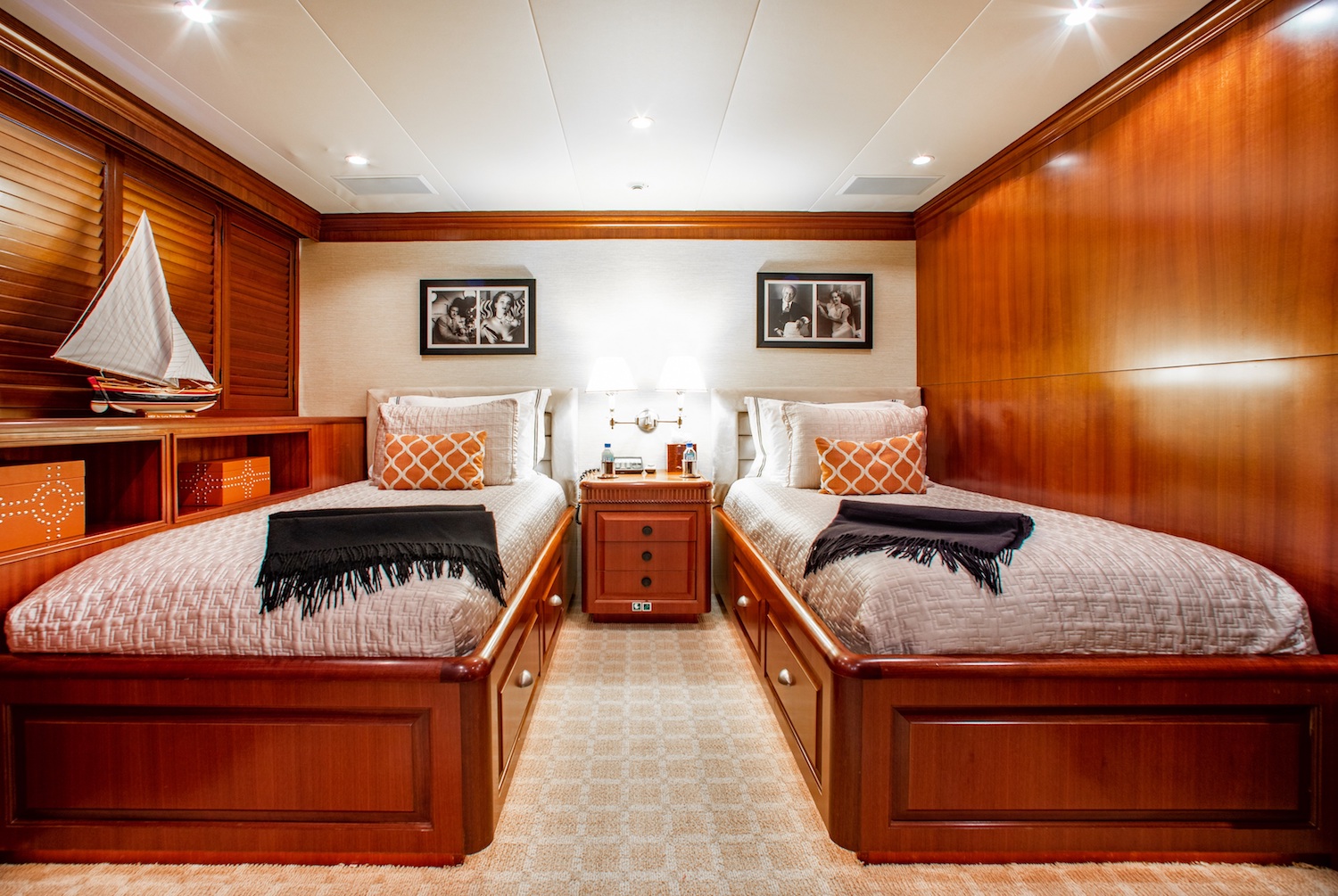 The master suite is located on the main deck and is finished in neutral tones with wood panelling and built-in cabinetry. This neutral colour palette runs throughout the yacht with bright accents of coral, orange and navy blue adding a burst of personality.