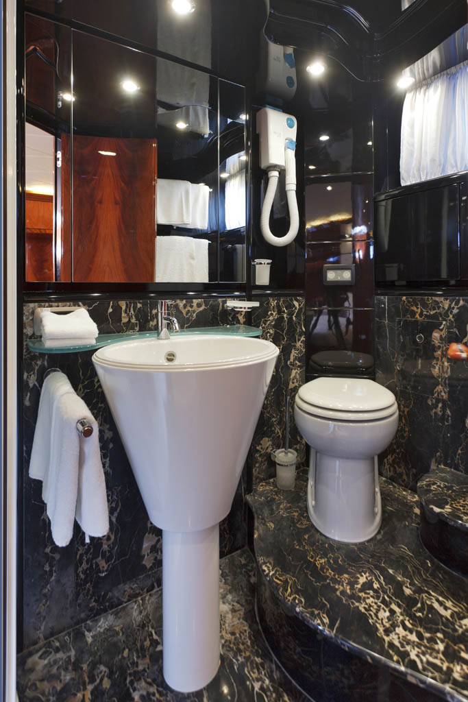 The master stateroom is amidships, and full beam of the yacht, with a centre, lined double bed, vanity and seating. The VIP cabin is forward and full beam of the yacht, with a centre, lined double bed. Two guest cabins each have single twin beds and a Pullman berth.