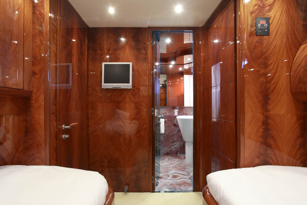 The salon is generous and features elongated side windows for optimum natural light, two large crisp white sofas, a glass coffee table, full entertainment systems and marble topped wet bar. A foyer on the starboard side leads to the full beam separate formal dining area, where all ten guests may dine in style.