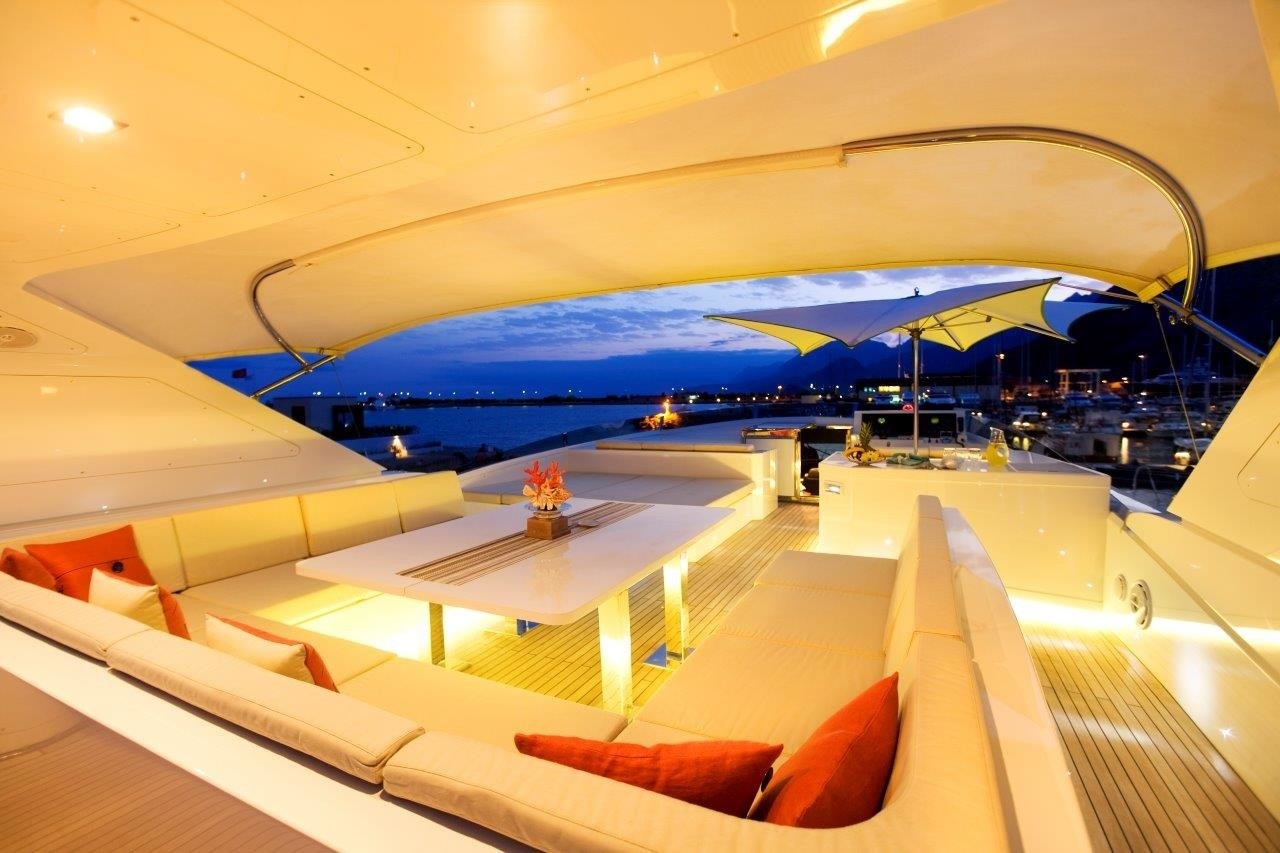 Partial shade adds to the comfort on the aft deck, while sliding glass doors lead into the salon, creating a truly social ambiance. The main deck wraps around the yacht 360°, allowing guests to wonder forward to a raised foredeck, with 2 ample sunpads.