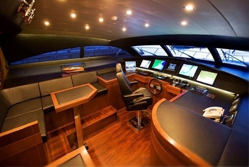 The flybridge deck features a further alfresco dining option, sunpads, chaise lounges, seating, removable Bimini shade and a complete wet bar.