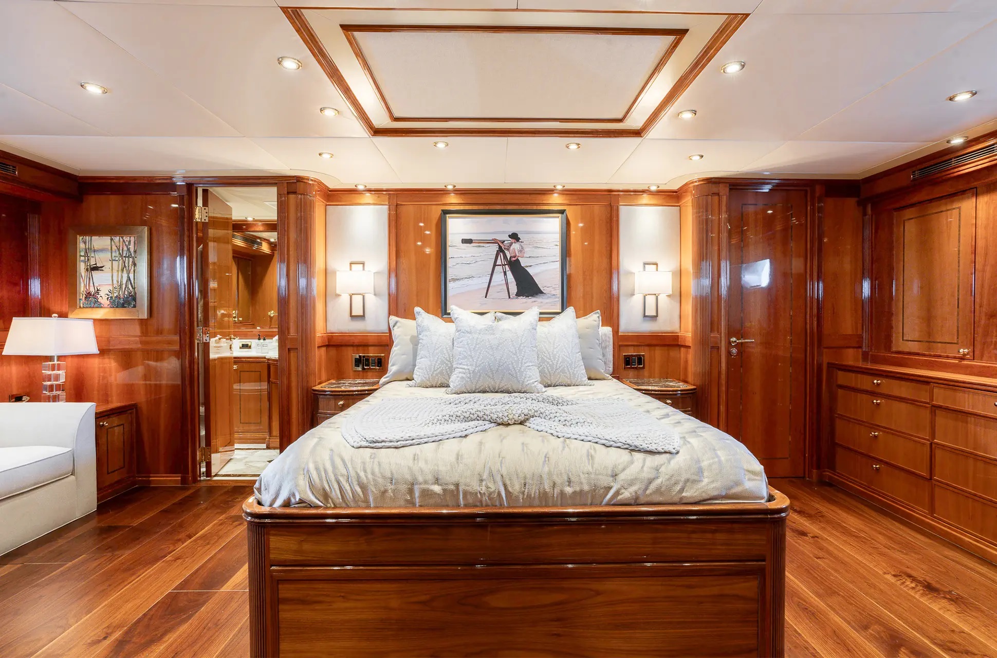Accommodation is in a full beam master stateroom on the main deck forward, complete with a continuation of the Brazilian woods floors, while below decks is the full beam VIP cabin and 2 double cabins, each with plush cream carpeting and private en-suite facilities.