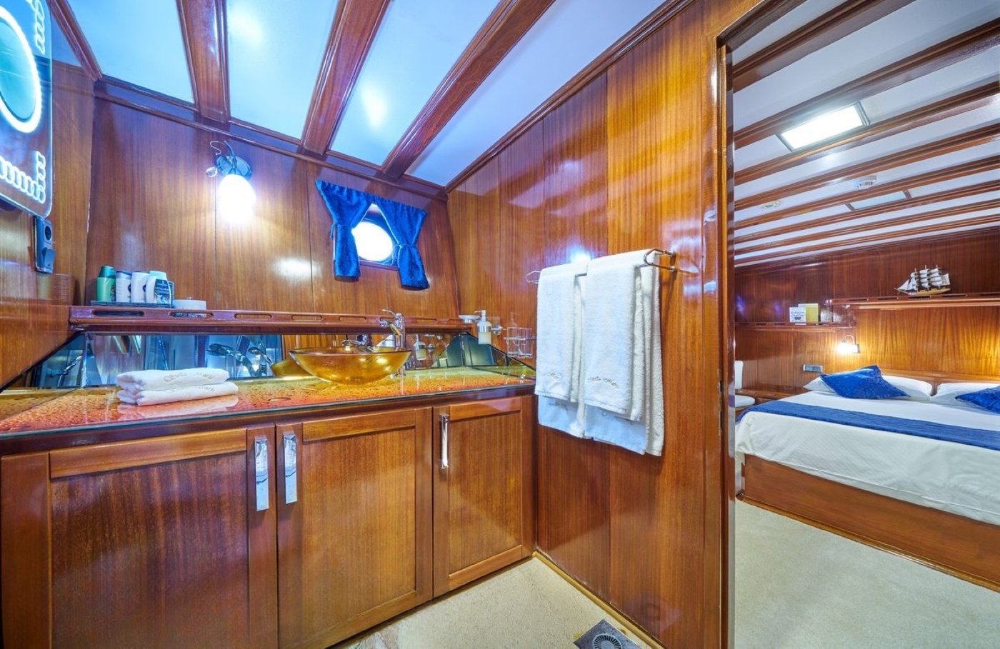 The salon and dining is an open plan, in a raised position, allowing for plenty of natural light and surrounding views. A formal dining area sits to starboard, boasting seating for all 12 guests. On the port side is an L shaped sofa and coffee table. Below decks, fore and aft are 6 guest cabins.