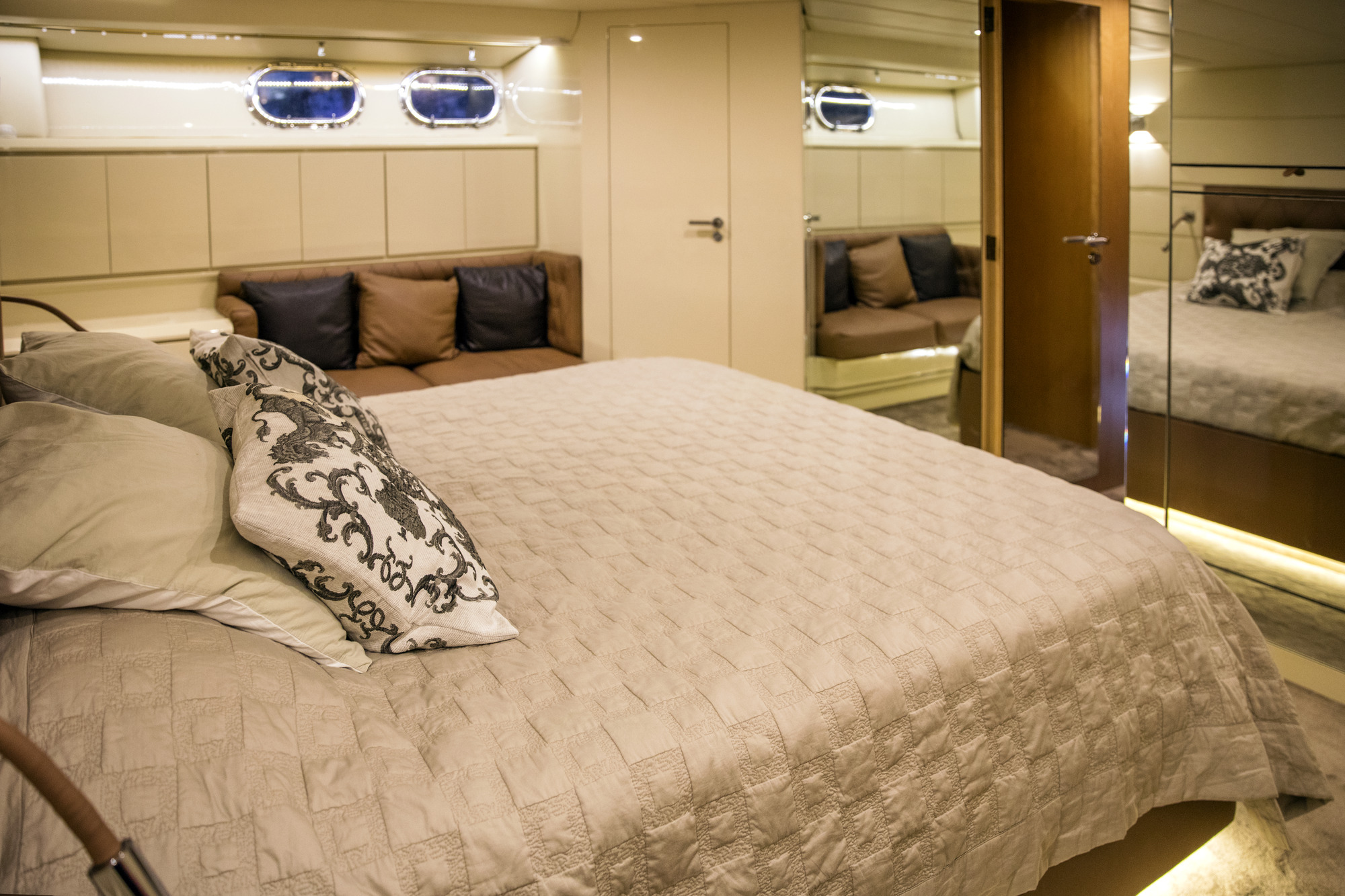 The lower deck hosts the guest and crew accommodation along with the engine room and storage for water toys.
