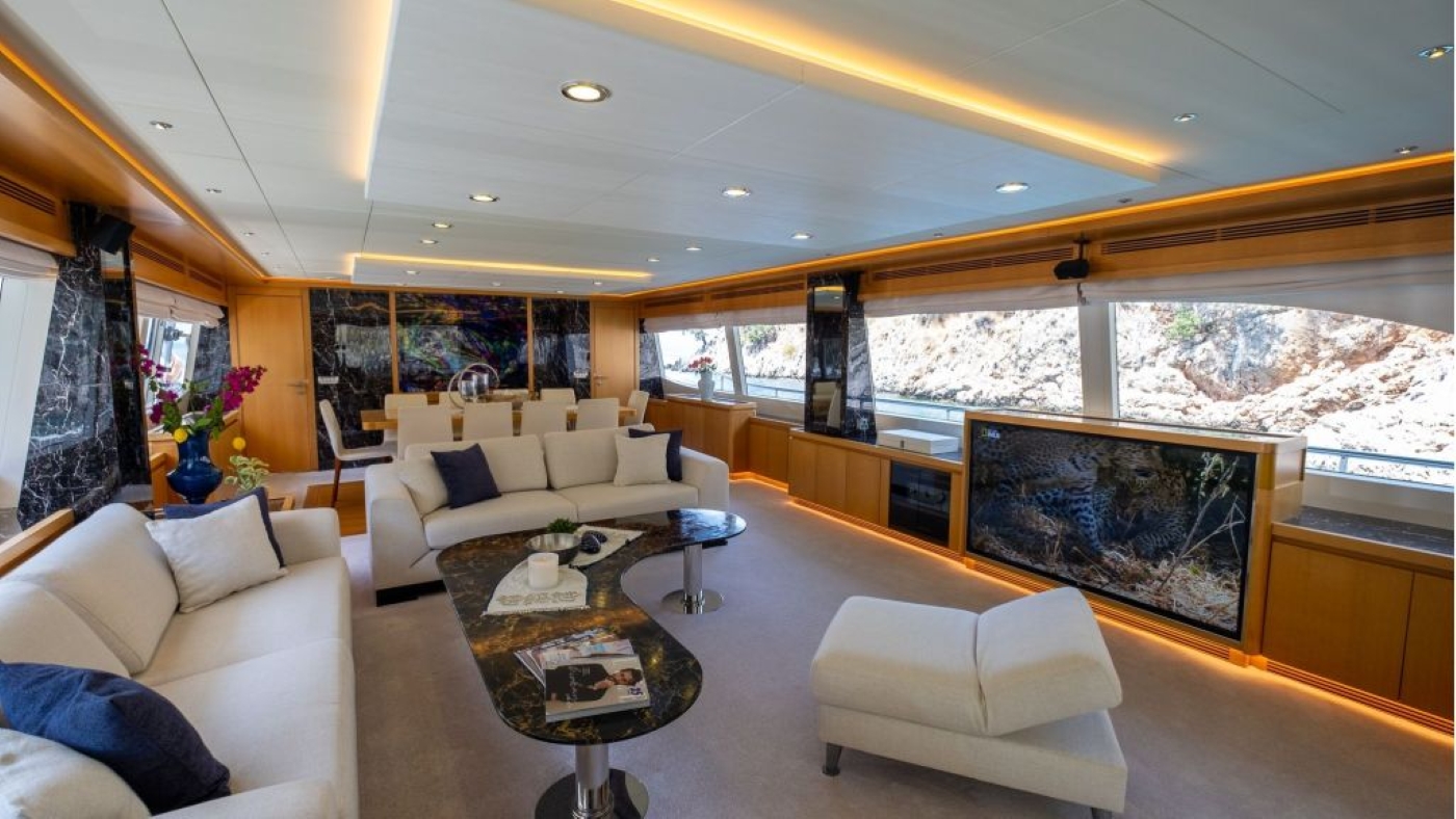 On the generous main deck, the salon and dining is an open plan aft, with the galley amidships and master stateroom forward. The salon offers an ivory white lounge suite, occasional chairs, coffee table and full entertainment aft, with the formal dining area forward.