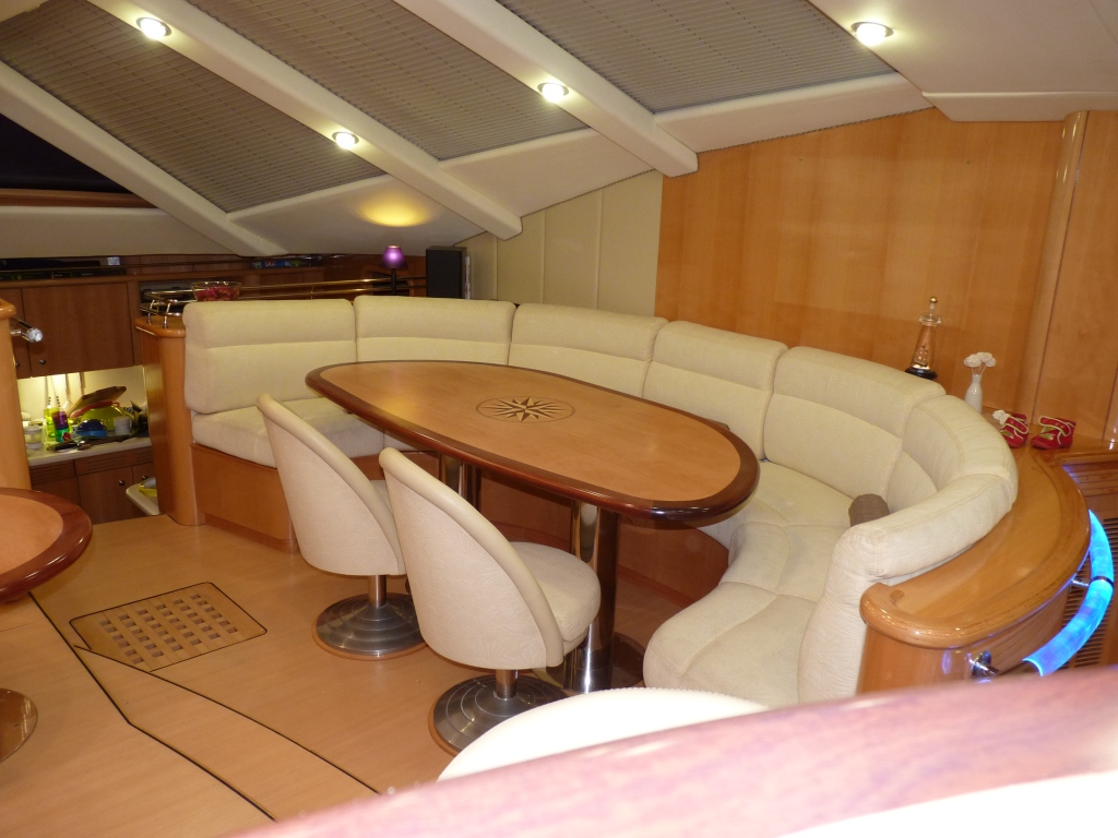 The salon is an open plan, offering ample seating, a formal dining table, cocktail table, complete wet bar and 3D TV entertainment. With surrounding windows and wide sliding glass doors that lead directly to the aft deck, the salon is versatile and functional, proving guests with an airy light ambiance and wonderful social venue.