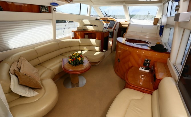 The salon offers a large semicircular sofa on the port side with a table, and a further seating to starboard. A compact yet modern galley is to starboard forward. Guest accommodation is below decks, in one double and 2 twin cabins.
