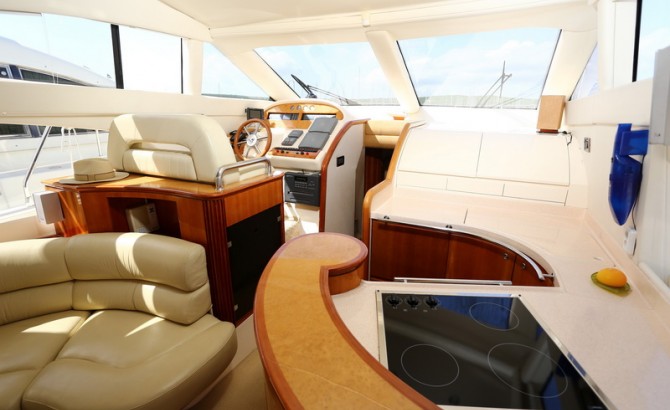 A compact yet modern galley is to starboard forward. Guest accommodation is below decks, in one double and 2 twin cabins.