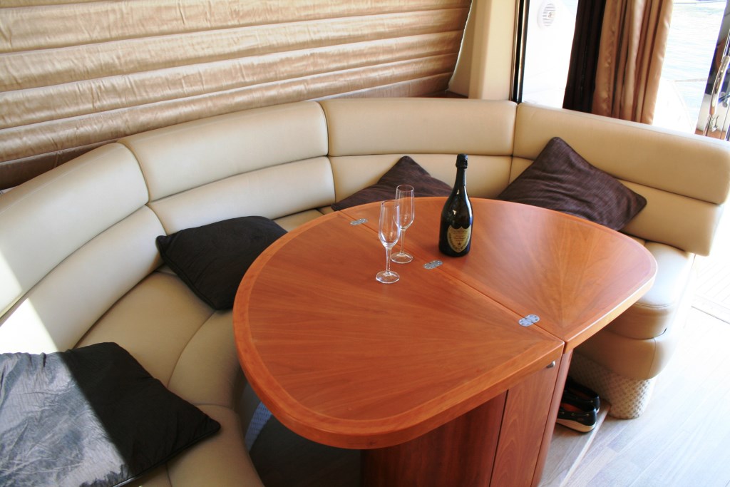 The salon benefits from plenty of natural light, thanks to elongated side windows, a large sliding glass door aft, full beam forward windscreen and retractable roof. The salon offers a large U shaped sofa and dining table on the starboard side, while to port is an occasional chair and TV entertainment.