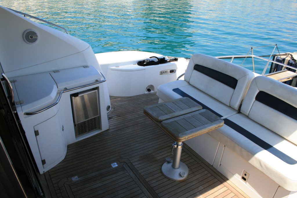 Adjacent to the salon, through wide sliding glass doors, is the spacious aft deck, complete with seating, an alfresco dining option, drinks fridge, BBQ station and sink. A flip down lid closes BBQ and sink, creating a wet bar, ideal for entertaining. A hydraulic lowering swim platform ensures guests effortless access to the water.