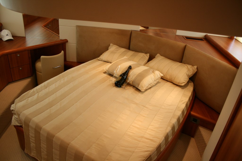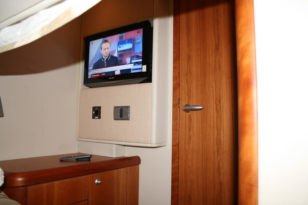 The salon benefits from plenty of natural light, thanks to elongated side windows, a large sliding glass door aft, full beam forward windscreen and retractable roof. The salon offers a large U shaped sofa and dining table on the starboard side, while to port is an occasional chair and TV entertainment.