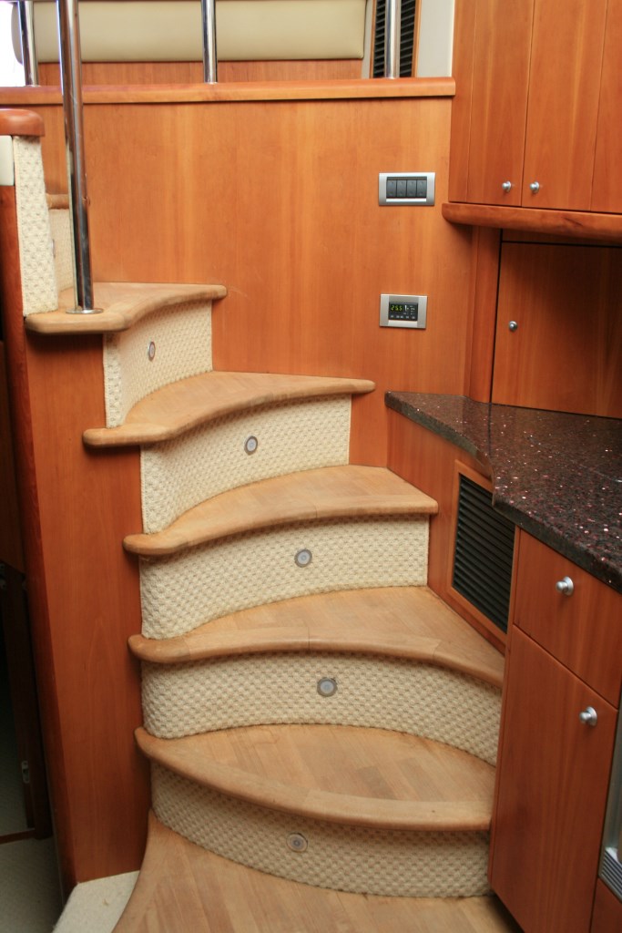 A curved stairs case on the forward port side leads to the fully equipped galley, continuing on to the 3 guest cabins.