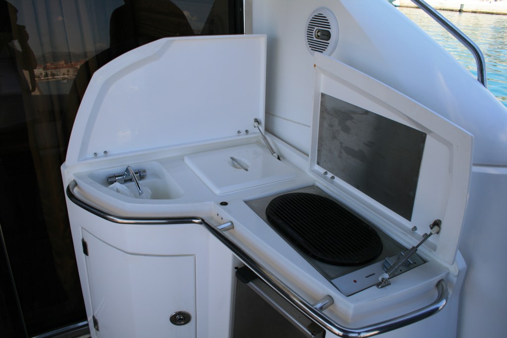 Adjacent to the salon, through wide sliding glass doors, is the spacious aft deck, complete with seating, an alfresco dining option, drinks fridge, BBQ station and sink. A flip down lid closes BBQ and sink, creating a wet bar, ideal for entertaining. A hydraulic lowering swim platform ensures guests effortless access to the water.