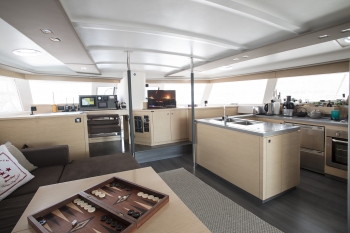 The salon and dining offers a large seating area with integrate formal dining table, well-appointed large galley and full entertainment systems. Surrounding windows bring in ample natural light, while providing spectacular views.