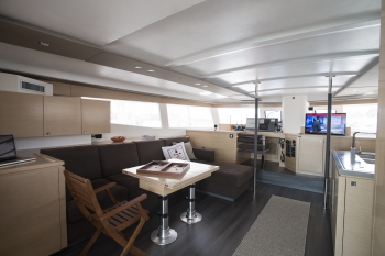 The salon and dining offers a large seating area with integrate formal dining table, well-appointed large galley and full entertainment systems. Surrounding windows bring in ample natural light, while providing spectacular views.