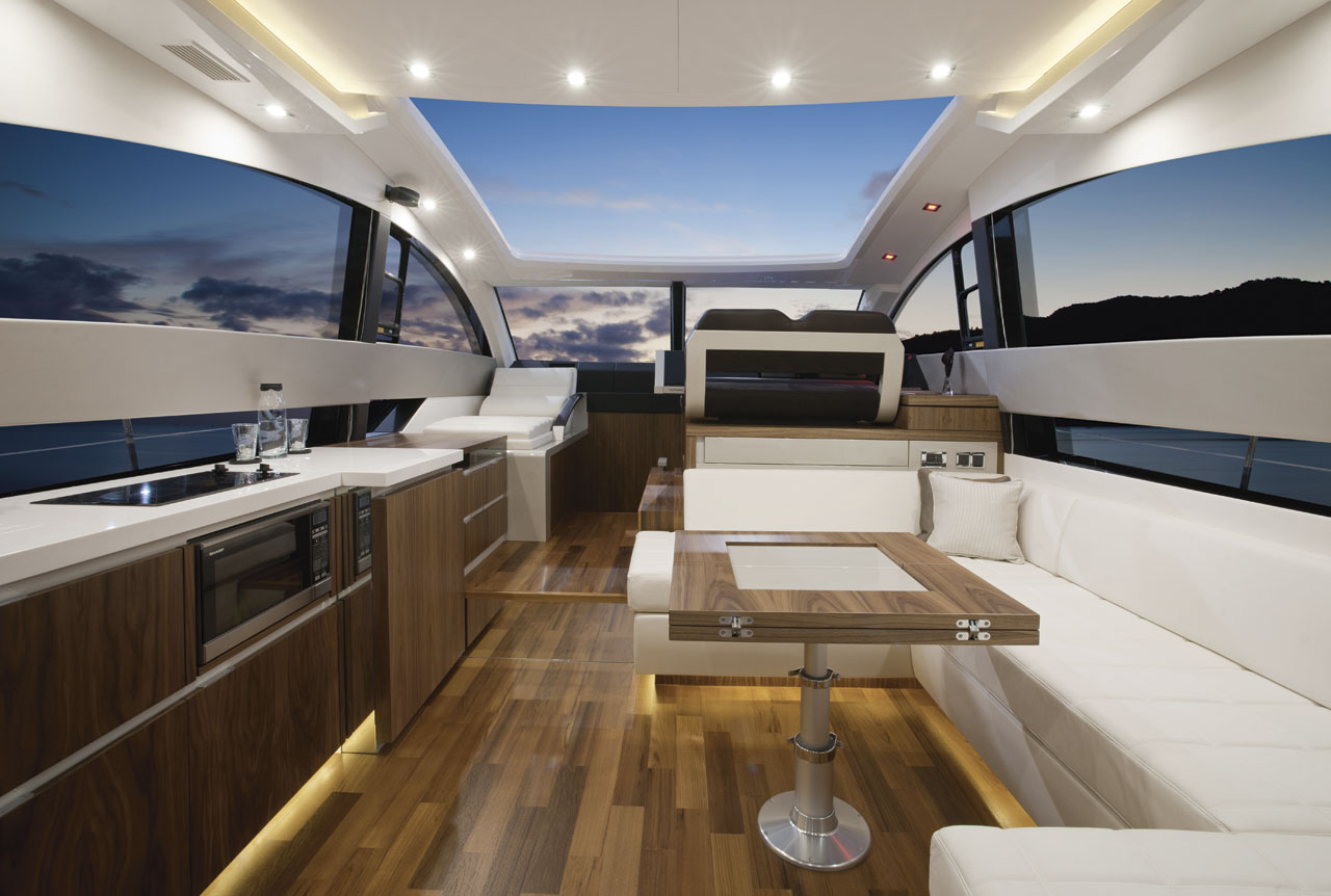 The main salon and galley is an integrated open plan, with a large sofa surrounding a convertible coffee, to formal dining table on the starboard side, and fully equipped galley to port. Elongated side windows, a retractable roof top and wide sliding glass doors aft, bring the outside in, creating a spacious and contemporary ambiance.
