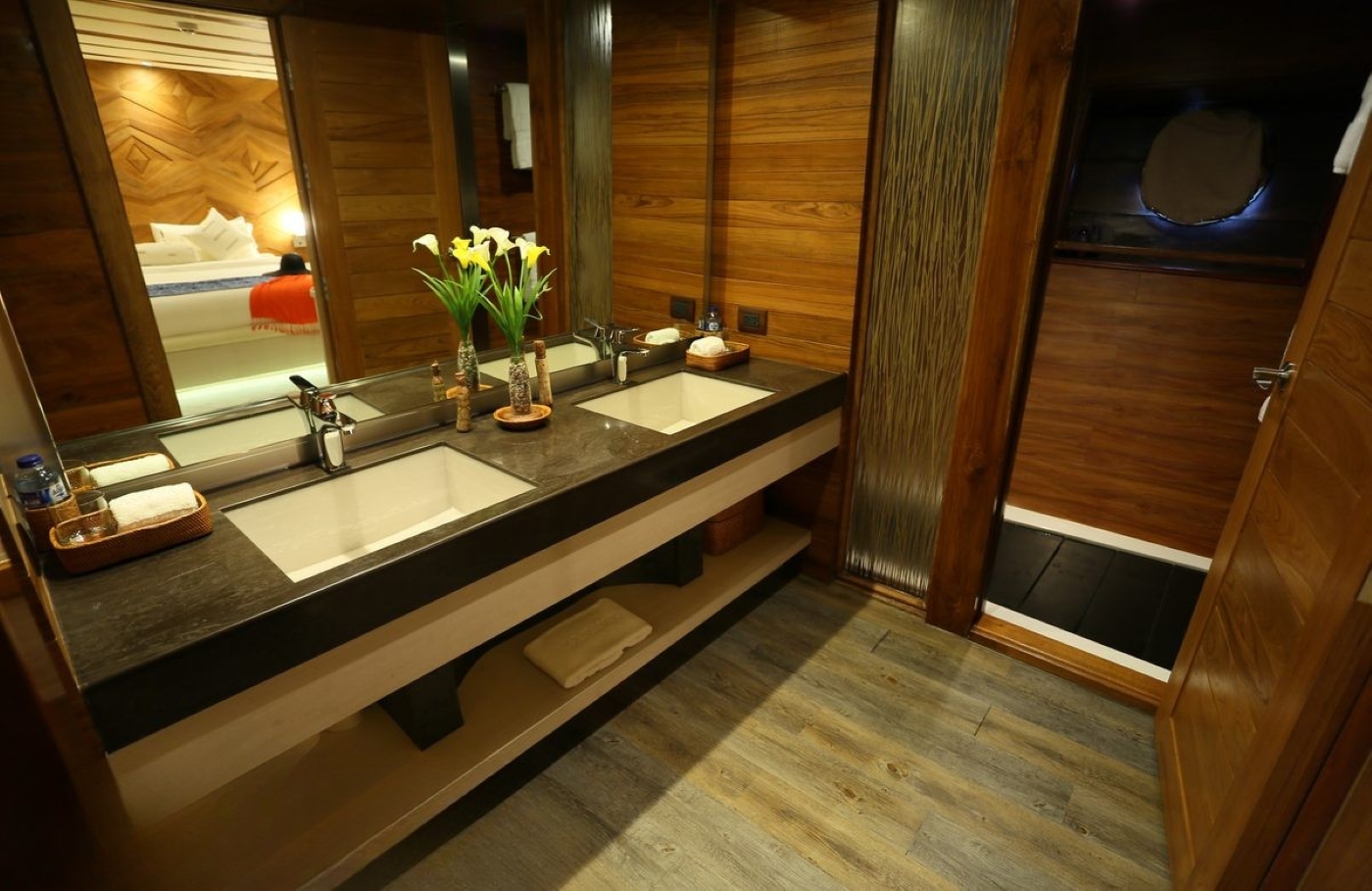Fourteen guests can be accommodated in elegant and stylish cabins, all with their own en-suite bathrooms. The accommodation is divided into one double master cabin with en-suite and dressing room, four double cabins and two twin cabins with en-suite bathrooms. There is a crew of 19 aboard.