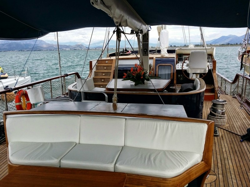 Crewed charter yacht TROIA has plenty of exterior living space on her lovely teak decks. The aft deck offers an alfresco dining table, with wrap around U shaped seating, a further seating area and optional shade. Side decks lead to the generous foredeck and ample sunpads.