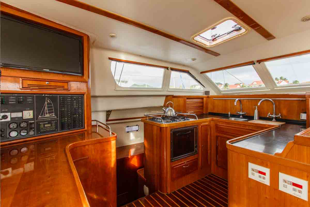 A capacious foredeck and dual trampolines are perfect for relaxing and sunning, both an anchor and under sail.