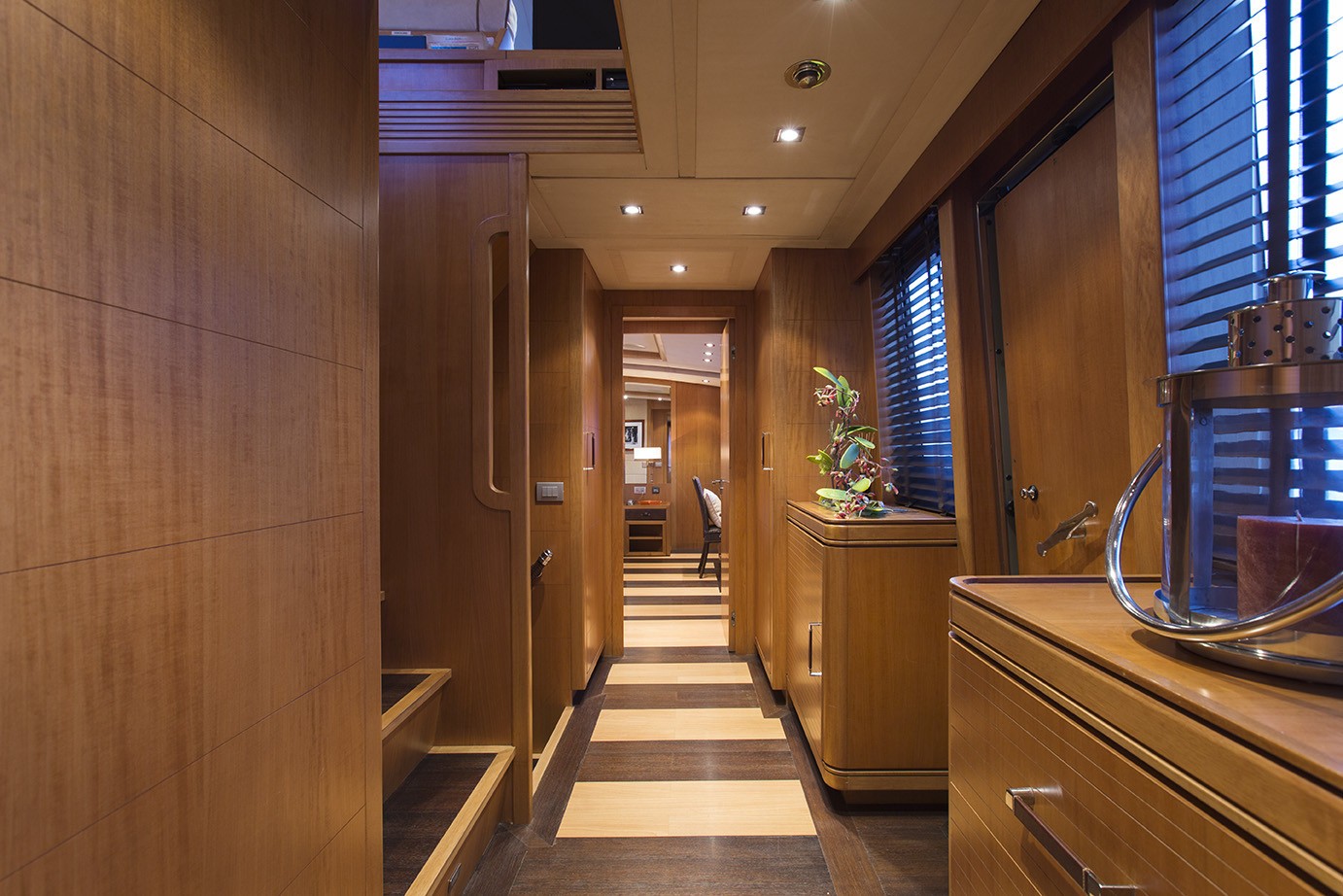 The master suite is on the main deck forward of the salon and features a center lined king size bed, desk, large en-suite with his and hers sinks and walk in wardrobe. Below decks, 2 double cabins can be adjoined to create one large VIP cabin with a personal study space, or remain as 2 double cabins.