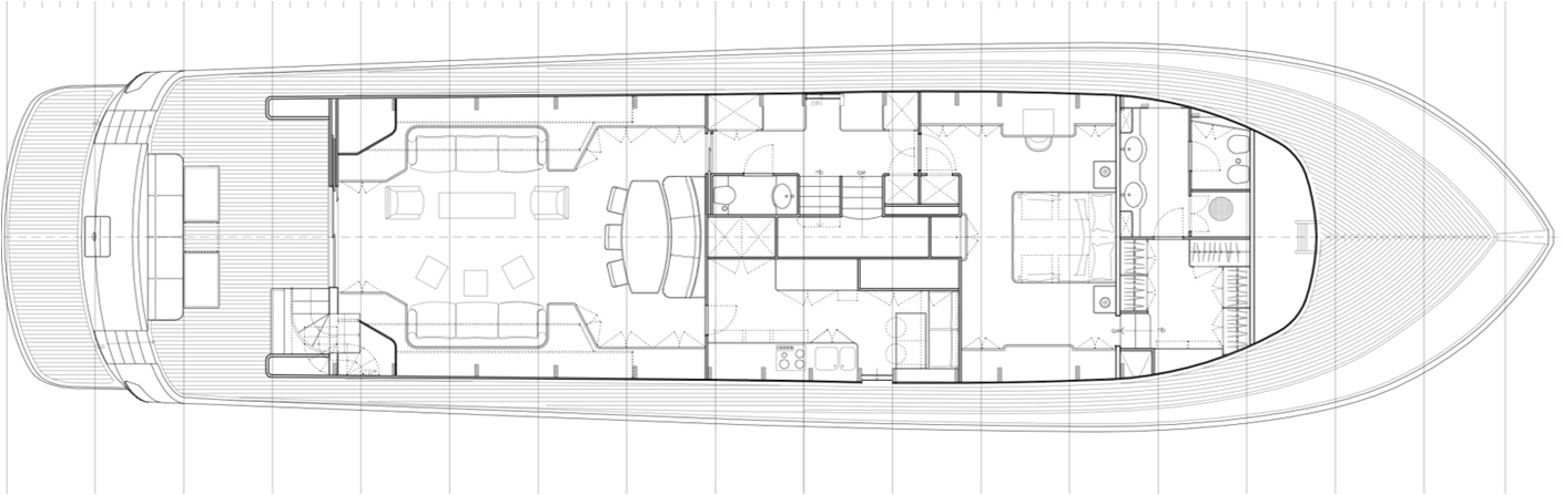 A foyer on the starboard side leads to a full beam master stateroom, while additional guest accommodation is below decks, in 4 en-suite cabins.