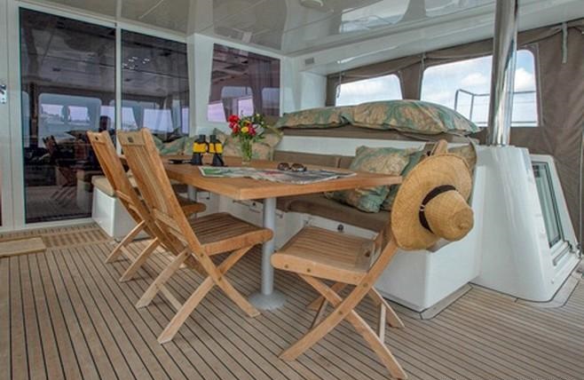 The salon and dining is contemporary open plan with 2 large settees, coffee table and formal dining area, all surrounded by wrap around panoramic windows. The galley is below in the port hull aft, creating further guest space.