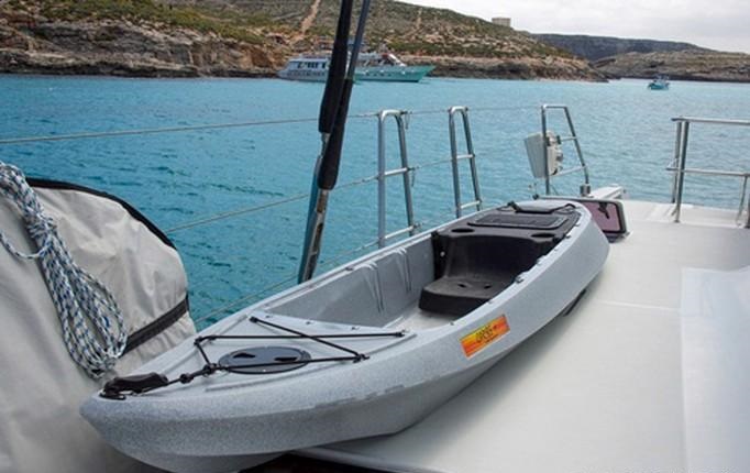 The salon and dining is contemporary open plan with 2 large settees, coffee table and formal dining area, all surrounded by wrap around panoramic windows. The galley is below in the port hull aft, creating further guest space.