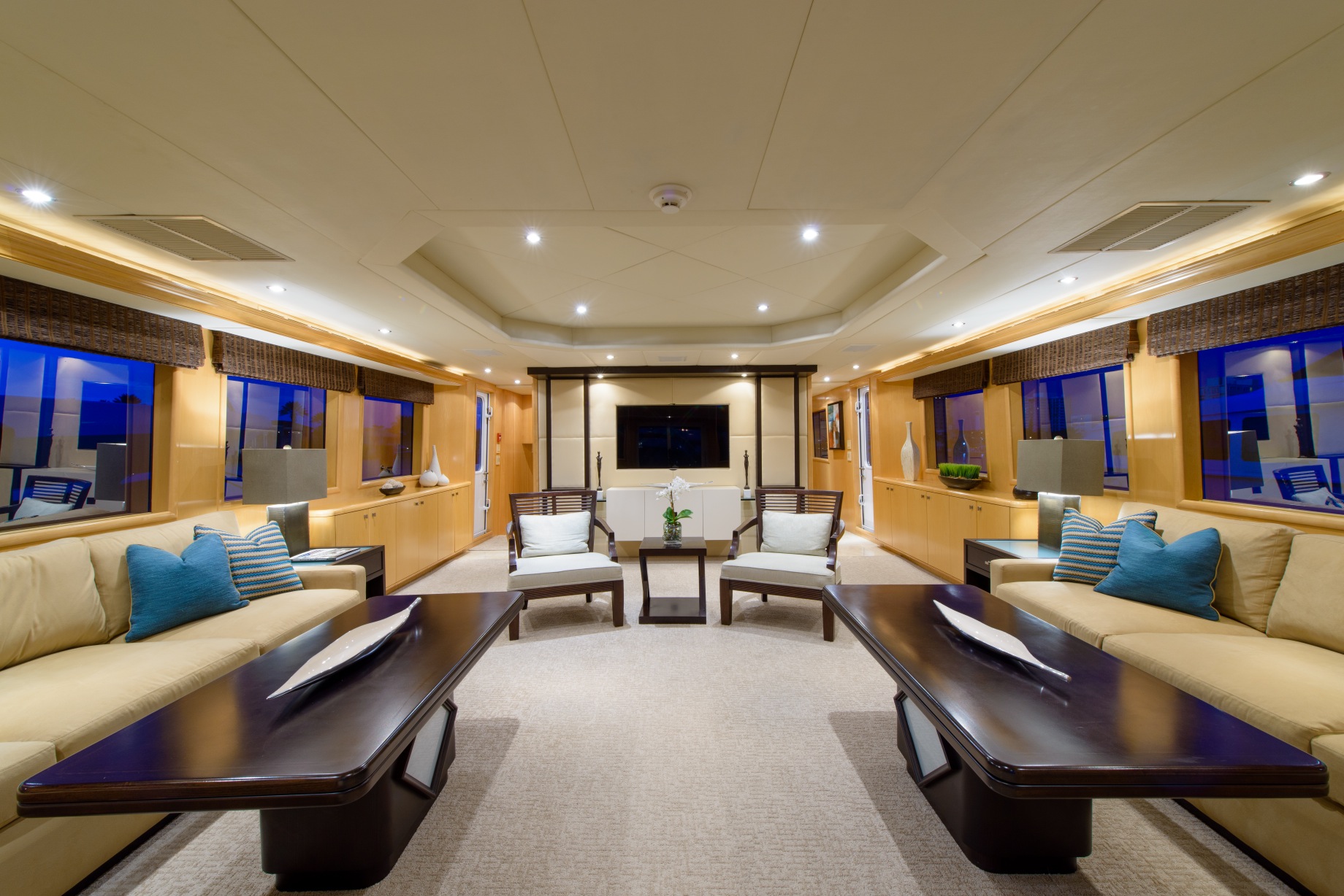 The salon is generous and boasts 2 opposing sofas, 2 coffee tables, occasional chairs and spectacular panoramic windows. Bespoke whicker drop down blinds ensure privacy and add an earthy natural ambiance. Forward of the salon is a large country style galley and dining area.