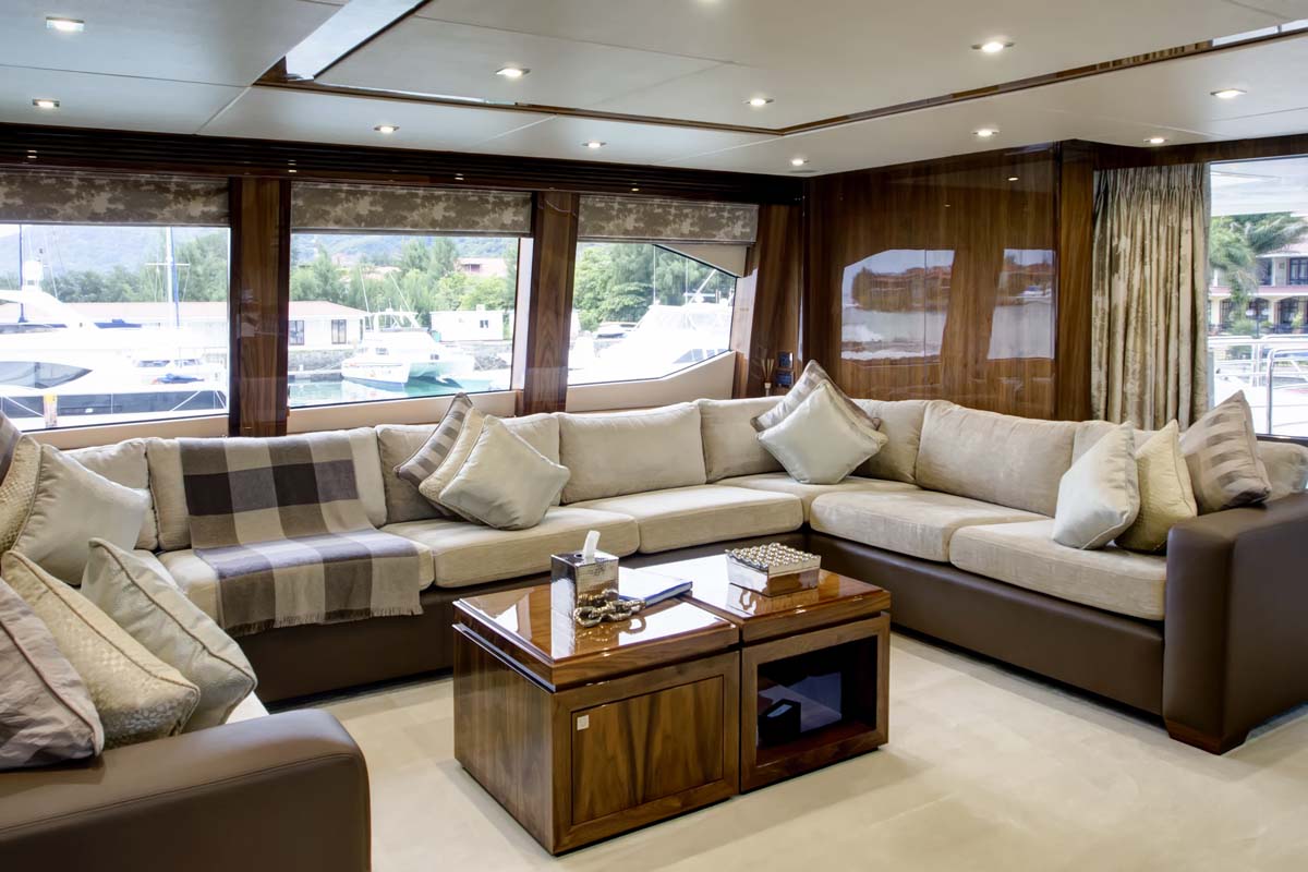 The LUSIA M motor yacht has an upper skylounge, with a slightly more casual feel, guests can relax on a large U-shaped sofa, or enjoy an evening cocktail from the wet bar, while marvelling at the stunning scenery.