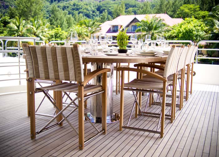 Formal dining aboard the luxury motor yacht LUSIA M is separate and forward of the salon, boasting a refined stylish ambiance. The LUSIA M motor yacht has an upper skylounge, with a slightly more casual feel, guests can relax on a large U-shaped sofa, or enjoy an evening cocktail from the wet bar, while marvelling at the stunning scenery.