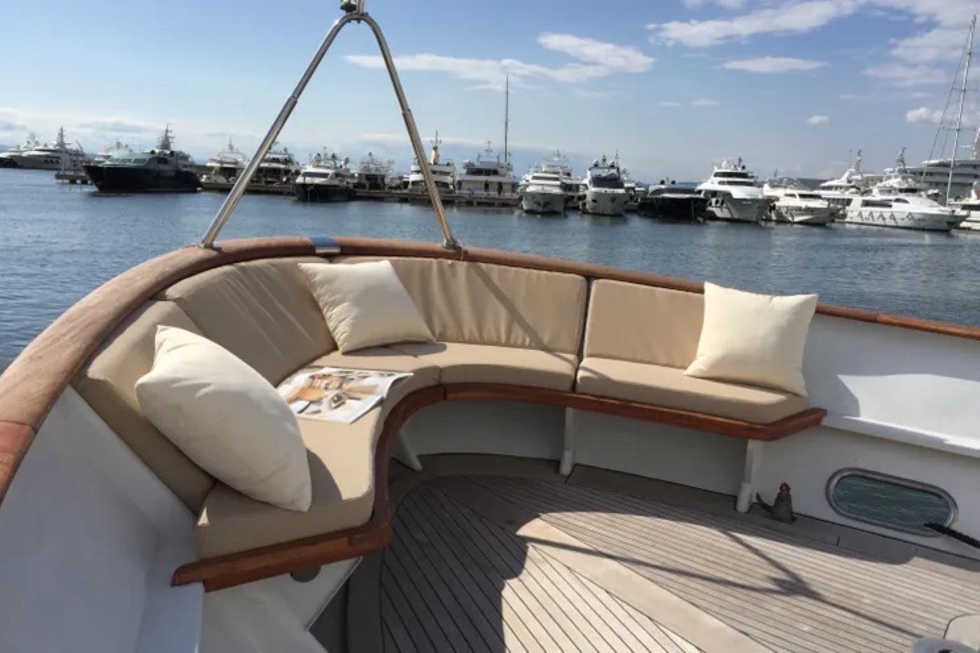 Crewed charter yacht OCEANE II has plenty of exterior living to enjoy in style. The aft deck is adjacent to the salon and offers shade and an alfresco dining option. On the foredeck, an upholstered seating area and bow seat are great for a quiet moment.