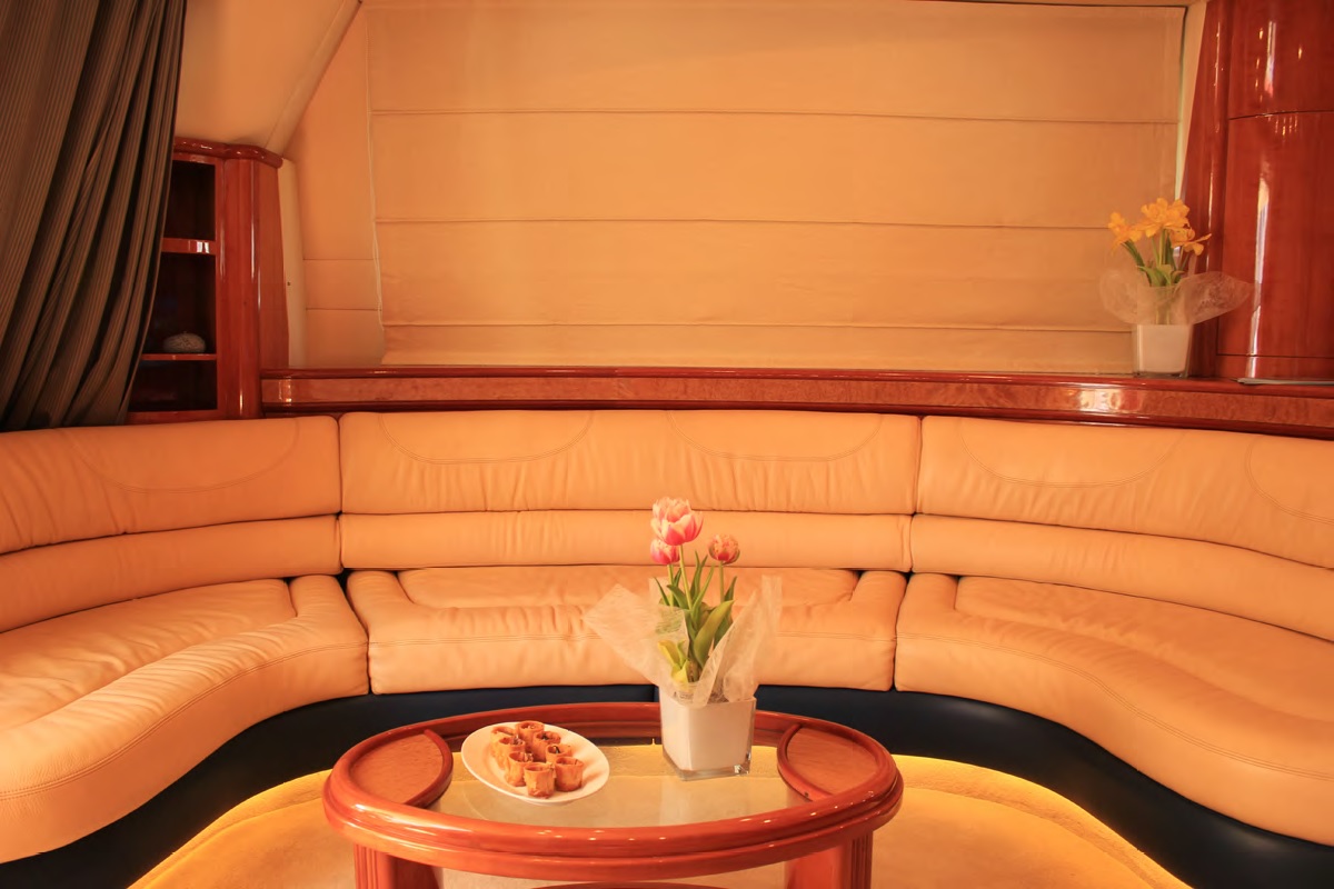 The salon boasts a generous lounge aft, with ample seating and full entertainment systems. Forward, the formal dining area is raised and seats 8 guests with ease. Surrounding windows allow for ample natural light, while showcasing fabulous views. Guest accommodation is on the lower deck, in 4 en-suite cabins.
