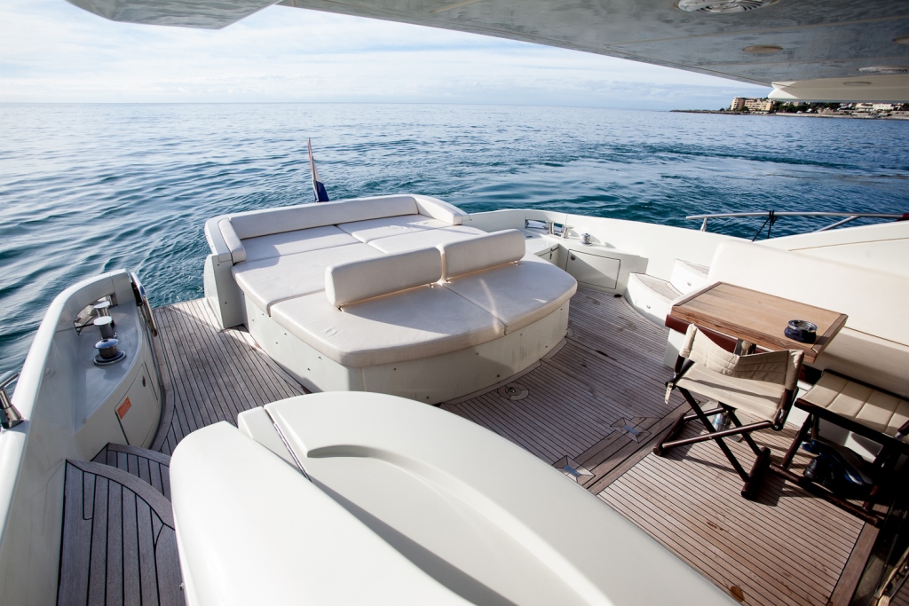Exterior living on the Azumit SAPORE DI SALE is plentiful and features a partially shaded aft deck with an alfresco dining option, wet bar, seating area and double sunpad.