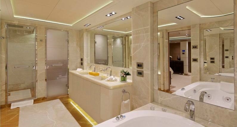 On the main deck, the open plan salon and dining area are ideal for entertaining and relaxing. Thanks to surrounding panoramic windows and wide aft sliding doors, this space receives ample natural light. A foyer on the main deck leads to the well-equipped gym.