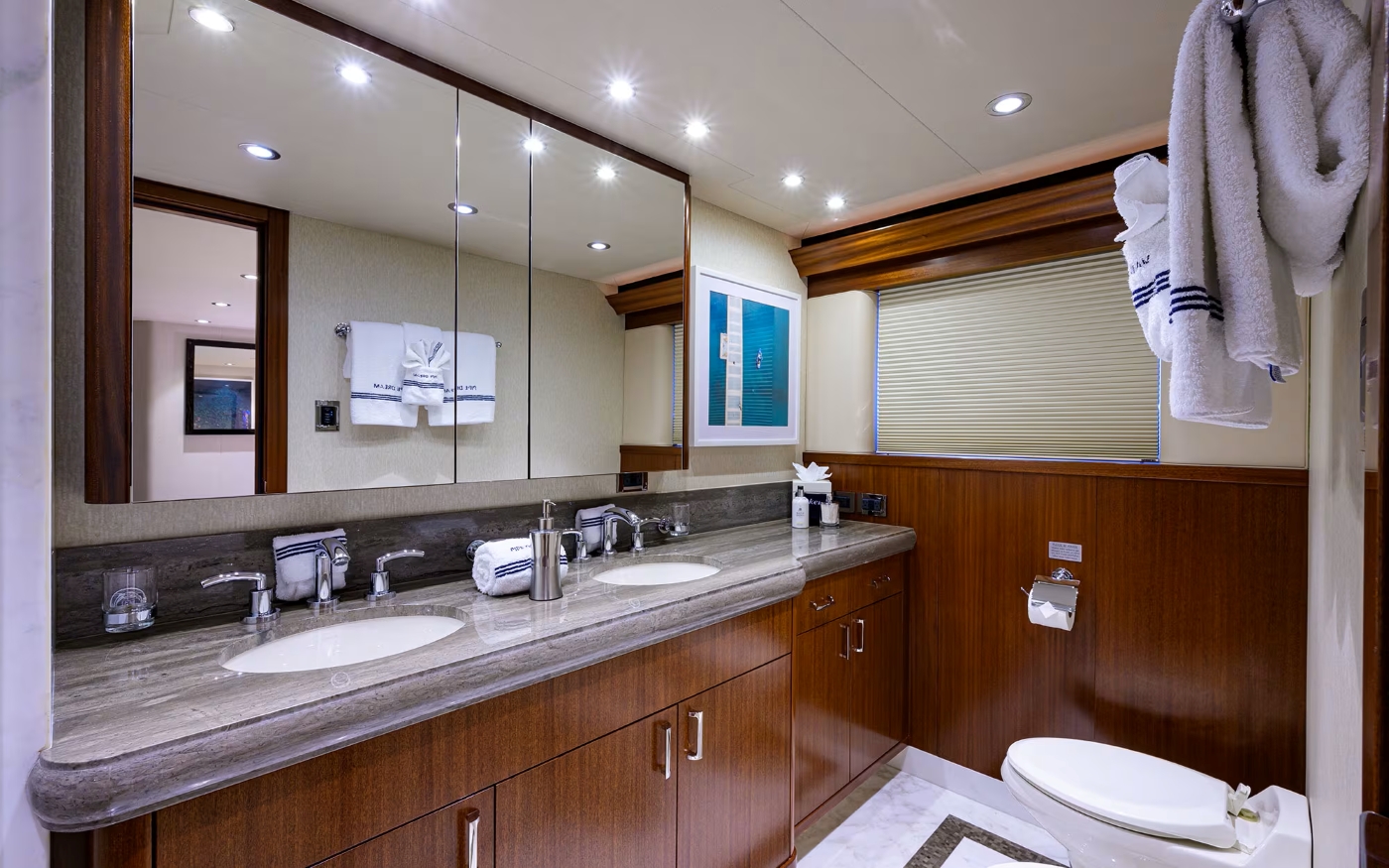 The main aft deck is shaded and offers an alfresco dining table, complete wet bar, audio and visual entertainment, built in aft seating and direct access to the salon. Wrap around decks lead forward to a large foredeck and raised sundeck, with 2 intimate chaise lounges.