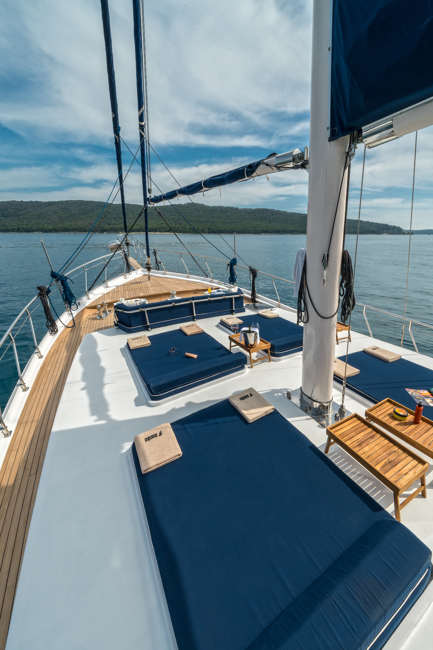 The foredeck is laid out with double sunbeds on the floor and the bow is left clear for observation and exercise. Two additional sunbeds can be found on the roof of the main salon.