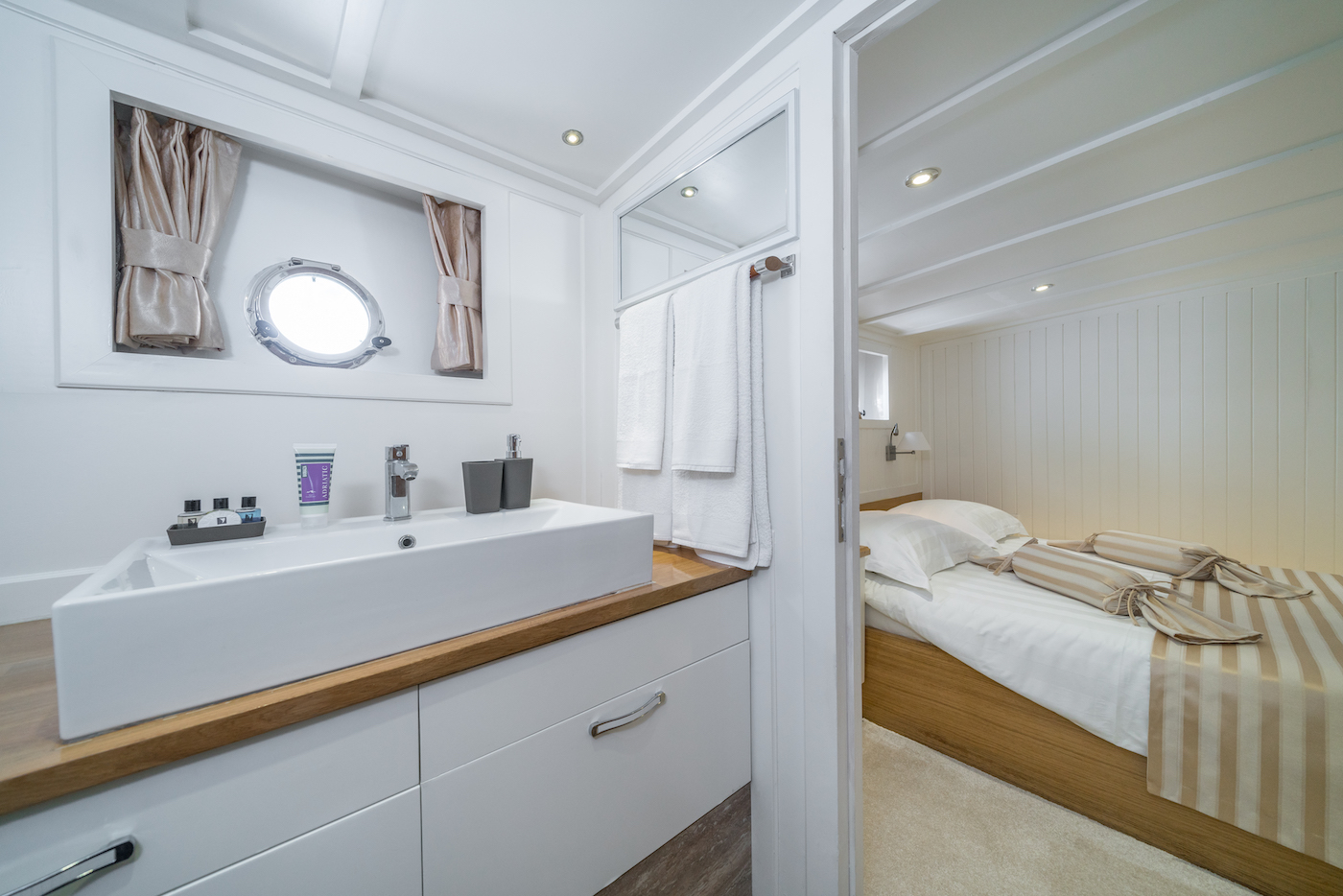 The lower deck hosts the guest and crew accommodation, along with the galley and storage for water toys.