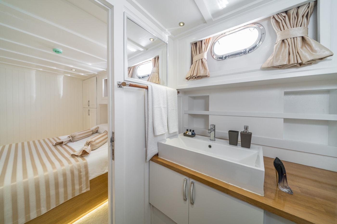 The lower deck hosts the guest and crew accommodation, along with the galley and storage for water toys.
