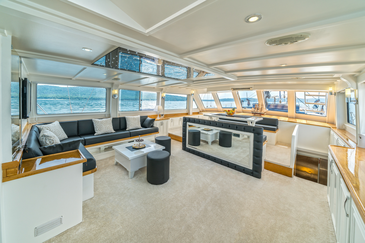 The lower deck hosts the guest and crew accommodation, along with the galley and storage for water toys.