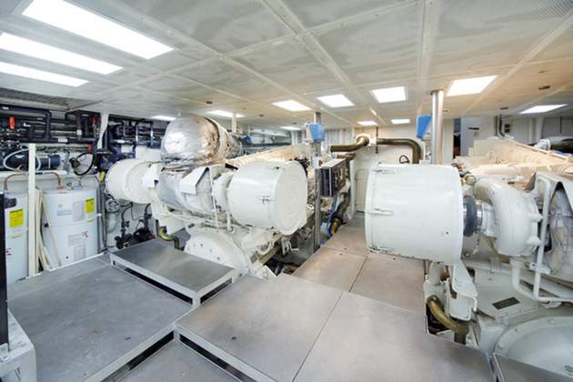 The salon is an open plan offering a marble-topped wet bar and spacious lounge aft, with a games table to port and the formal dining area forward. An innovative feature envelopes the formal dining area, enclosing it from the well-appointed galley, allowing guests to retire to the salon after a meal, uninterrupted of crew duties.