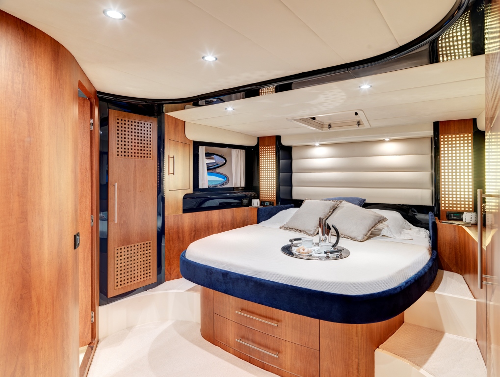 Crewed charter yacht SPACE has a contemporary interior décor of crisp whites, warm wood panels and splashes of sea blues, creating a welcome and timeless ambiance.