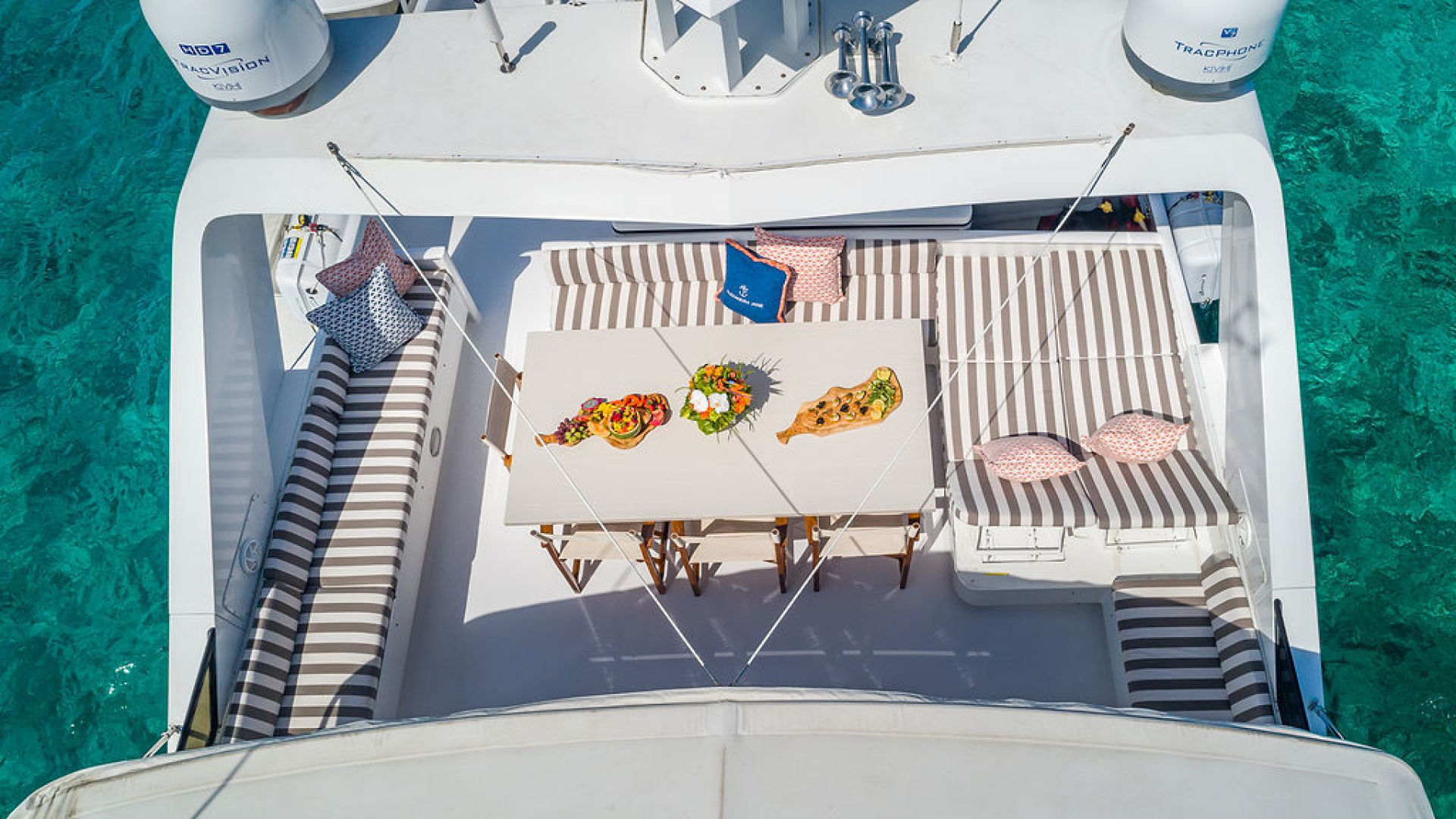 Crewed charter yacht ALEXANDRA JANE features ample exterior living on 2 decks. The aft deck is adjacent to the salon and has an alfresco dining table and additional seating.
