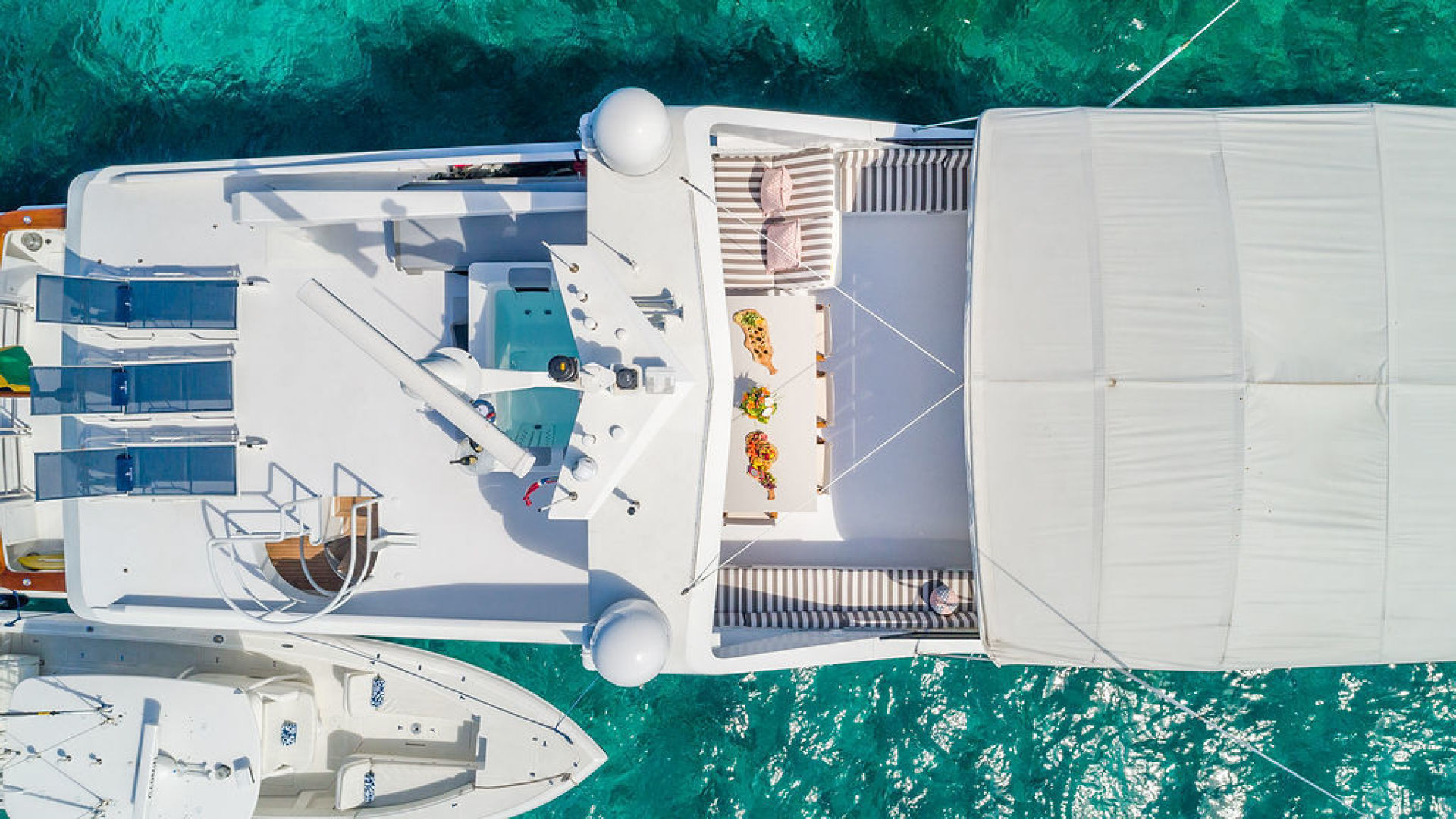 Crewed charter yacht ALEXANDRA JANE features ample exterior living on 2 decks. The aft deck is adjacent to the salon and has an alfresco dining table and additional seating.