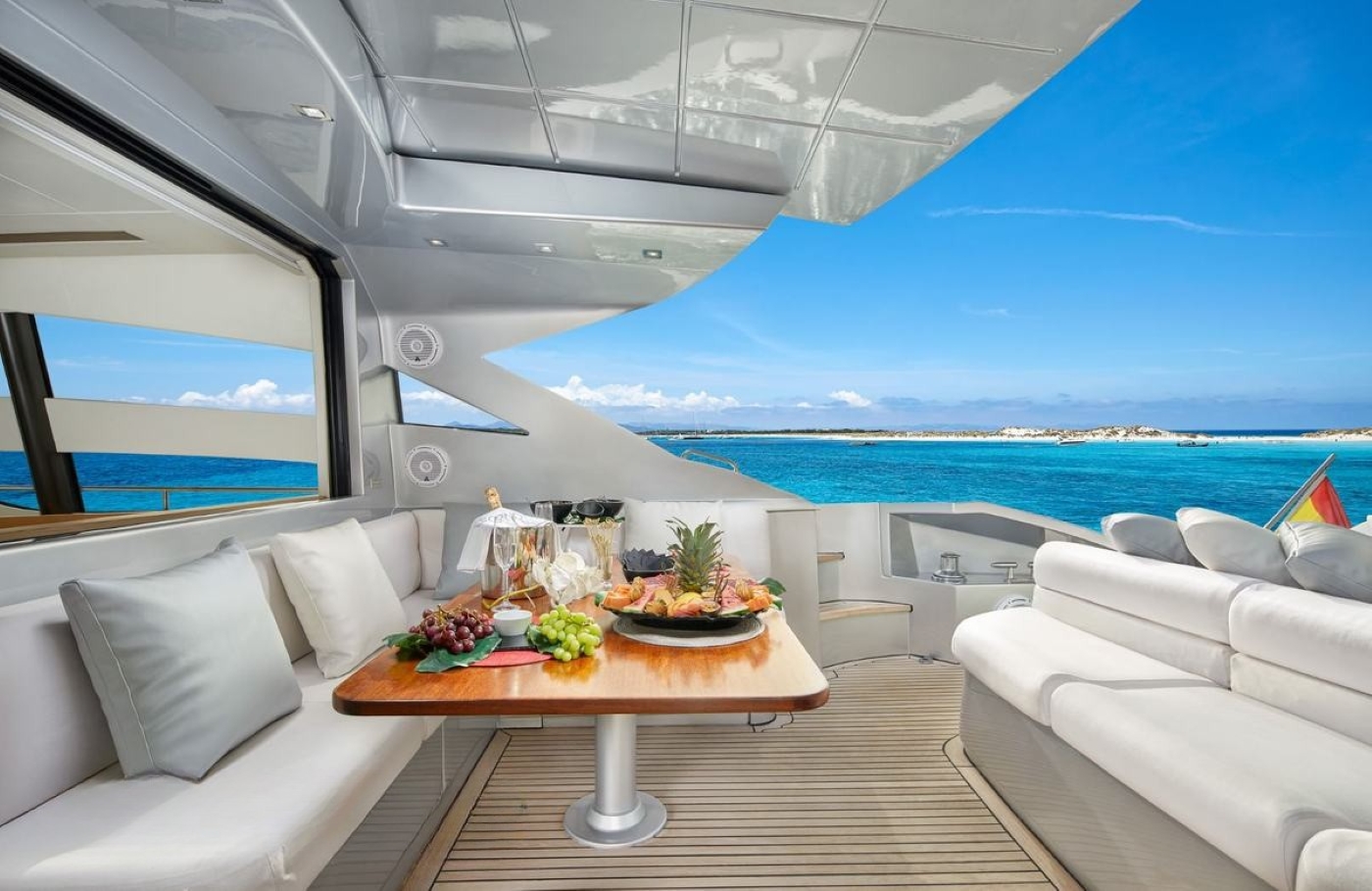 The salon opens completely to the shaded aft deck and generous alfresco dining option. Further aft ample seating and a massive sunpad, provide a fabulous social venue. For the active in the group, an extended swim platform is the ...