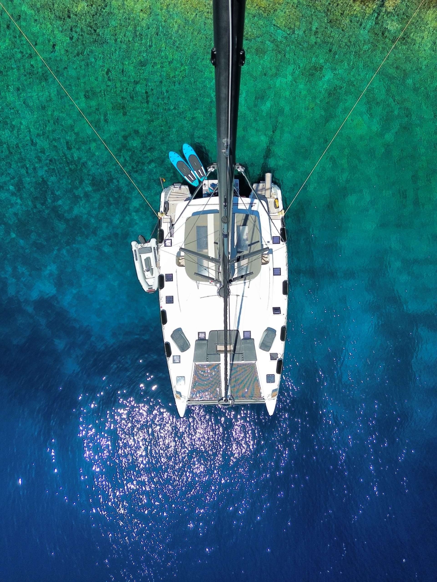 Further aft is a large deck space with access to the steps leading to the water toys on offer. On the foredeck is cockpit designed for sunning as well as 2 large trampolines, which are perfect for unwinding with a great book. An upper deck is shaded and offers the main helm and seating.