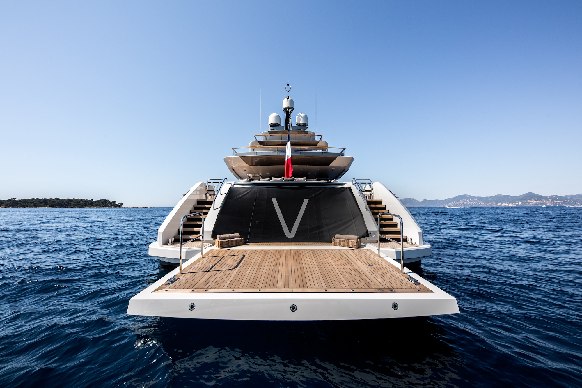 The main deck aft has an alfresco dining table, wet bar, fabulous sun pad seating area and partial shade, from here guests can easily access the swim platform and fold out the teak beach. Her upper deck is adjacent to the sky lounge, offering a further alfresco dining space and seating.