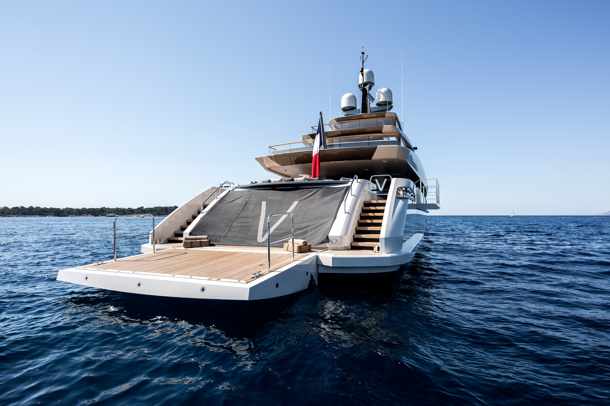 The main deck aft has an alfresco dining table, wet bar, fabulous sun pad seating area and partial shade, from here guests can easily access the swim platform and fold out the teak beach. Her upper deck is adjacent to the sky lounge, offering a further alfresco dining space and seating.