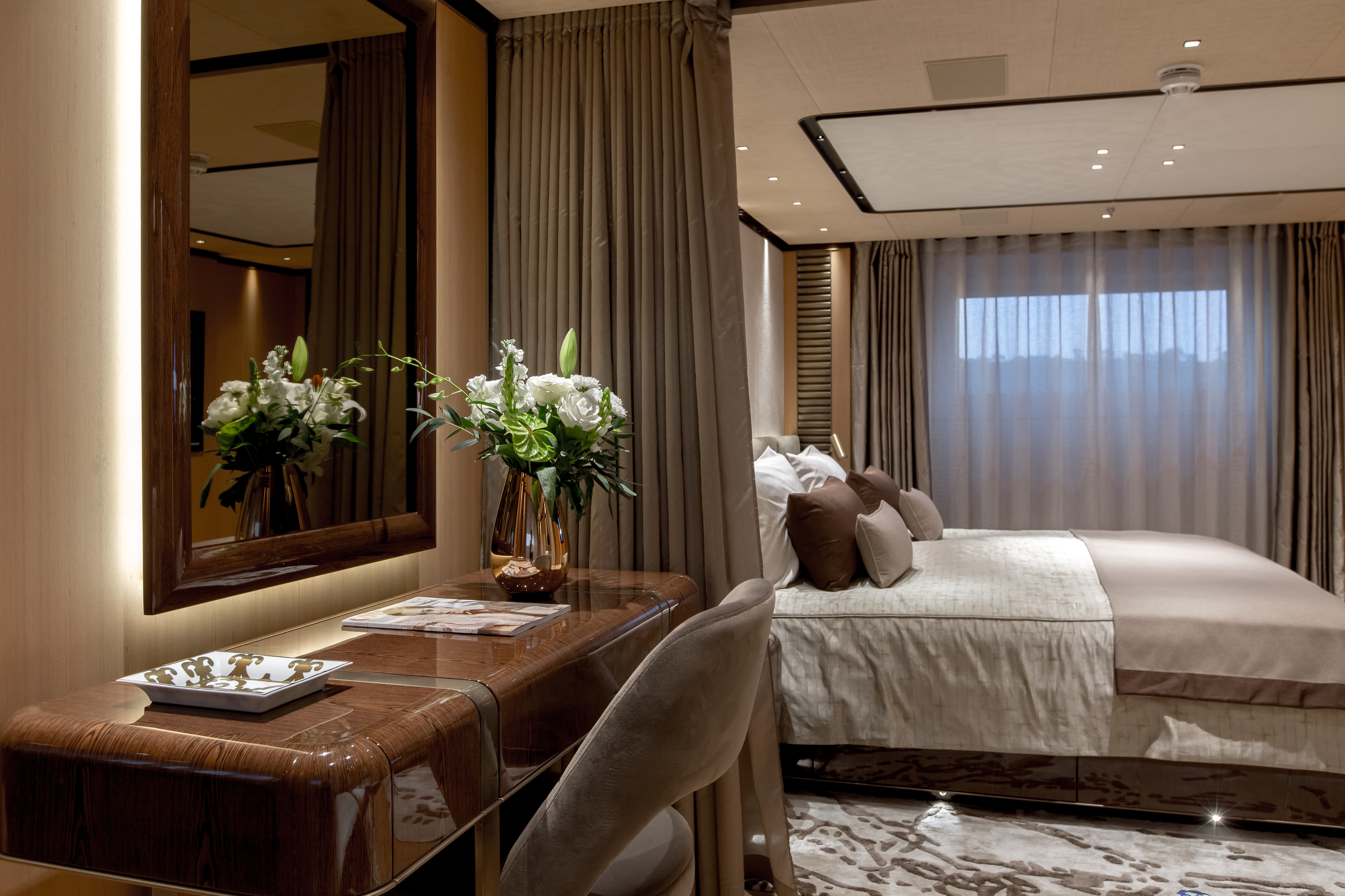 The luxurious Master stateroom and VIP cabins are forward of the salon and dining. An upper deck offers a sky lounge aft and the bridge forward. Tankoa superyacht Vertige provides deluxe accommodation in six cabins, including the main deck full-beam master and VIP suite, as well as four lower deck cabins for up to 12 charter guests.